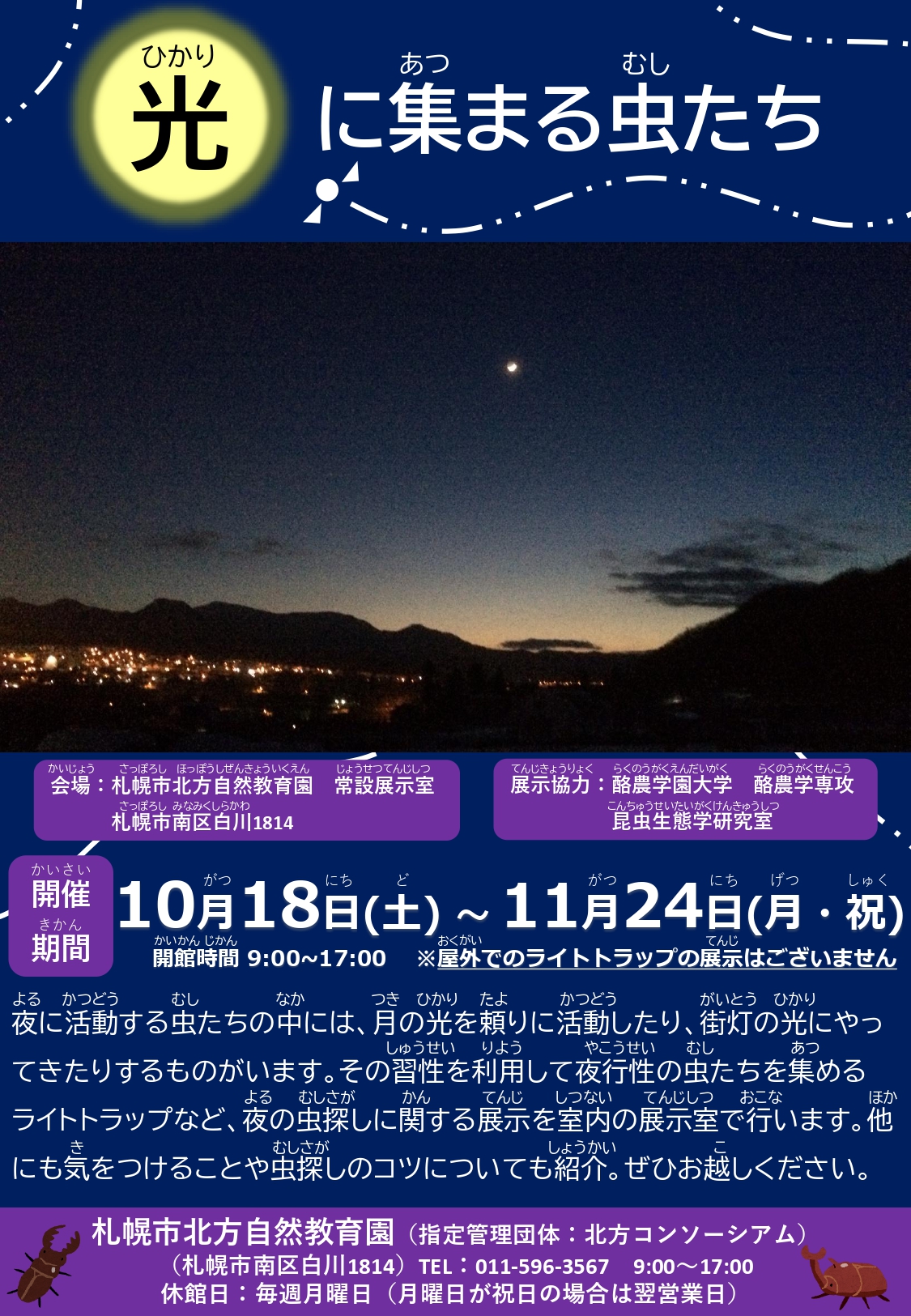 今回は酪農学園大学の皆様にご協力をいただき「光に集まる虫たち」に焦点を当てた企画展を実施いたします。