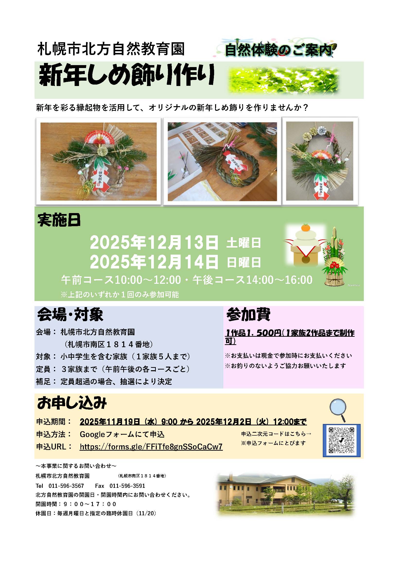 | 内容 | 札幌市北方自然教育園にて、「新年しめ飾り作り」イベントを開催いたします。 新年を彩る縁起物を用いて、世界にひとつだけのオリジナルしめ飾りを作ってみませんか。 詳細は、添付のチラシをご確認ください。 |