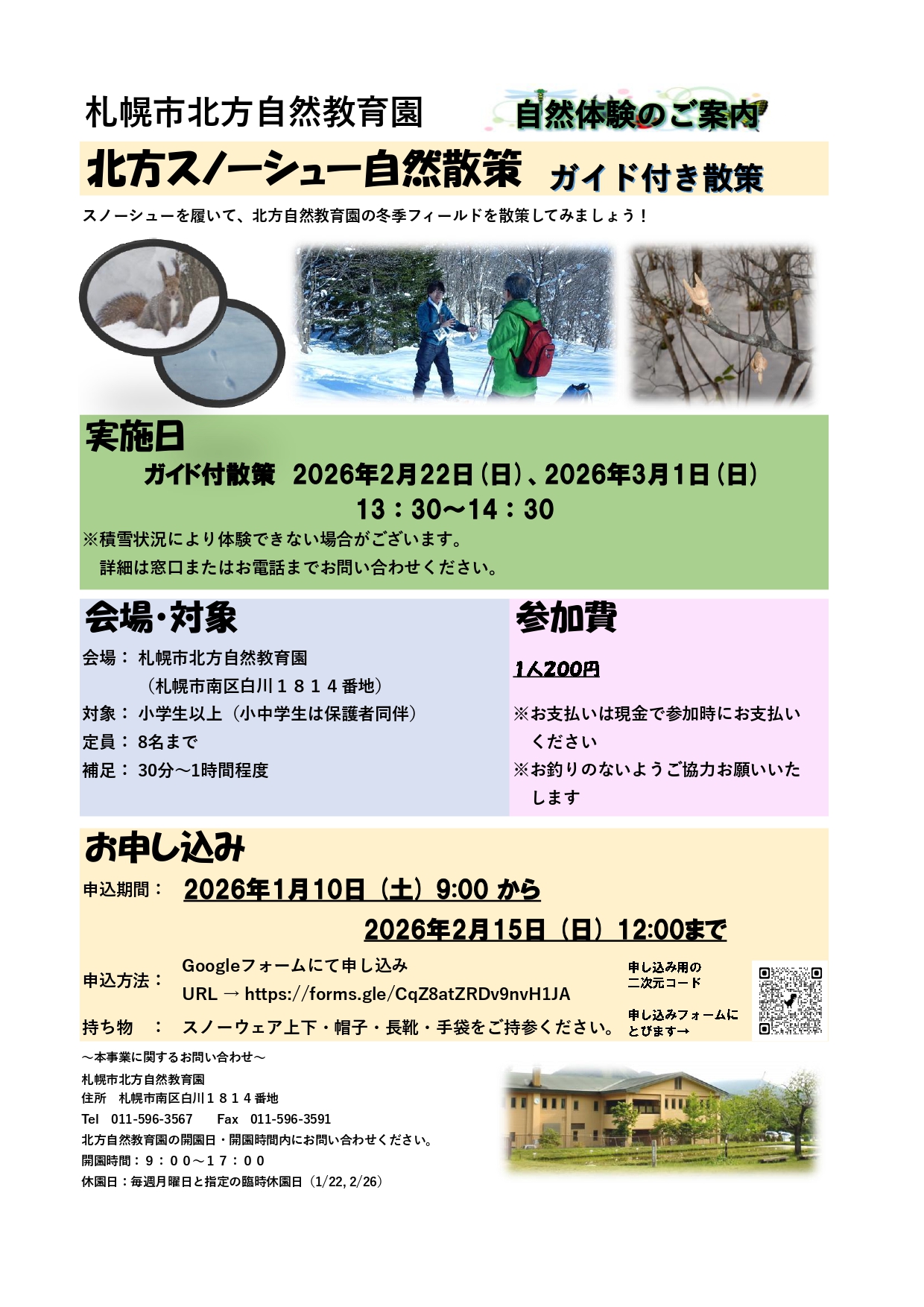| 申込方法 | 自由散策は当日受付にてお申込みください ガイド付き散策は、1月10日(土)9:00~2月25日(火)12:00までに Googleフォーム(右記リンク)にて申込 https://forms.gle/a6QDBW8FZFW8MZEd9 |