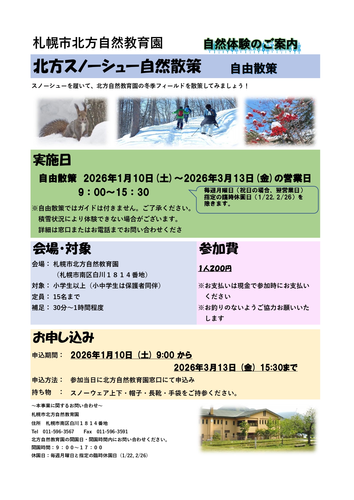 | 内容 | スノーシューを履いて、冬芽や鳥類など、園内の冬ならではの自然を楽しみましょう! |